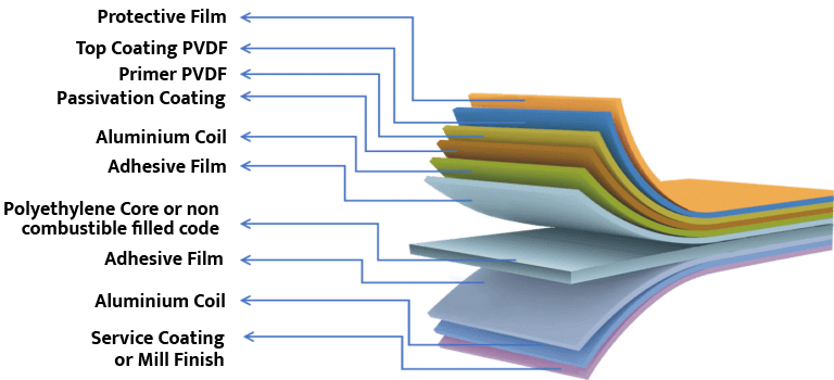 Aluminium composite panels are made using the lamination method. Its top and bottom layers are coated aluminium sheets, with a polyethylene core sandwiched between them. It is formed of;
